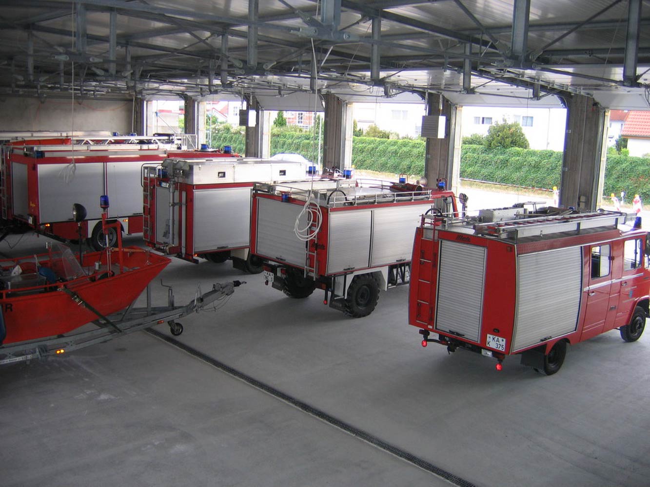 EG: Funkzentrale mit Stabsraum, Umkleiden Einsatzkräfte, Werkstätten, Fahrzeughalle 763 m² mit 14 Stellplätzen und Lagermöglichkeiten; Kfz-Werkstatthalle: 72 m²