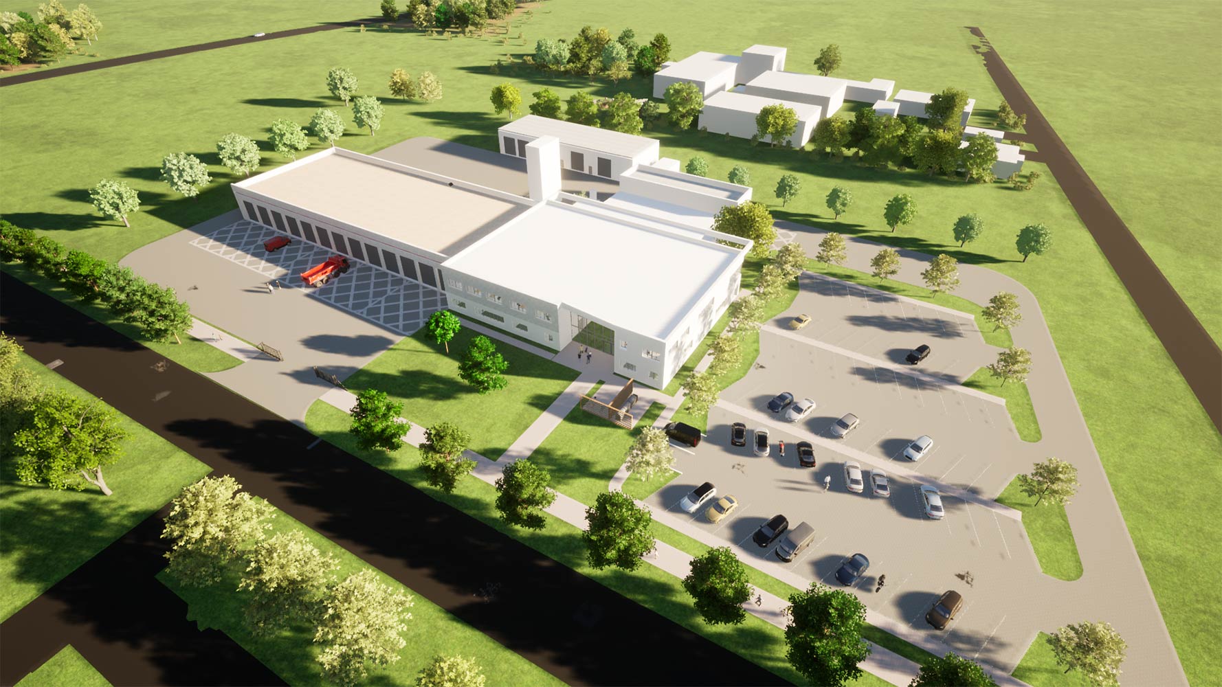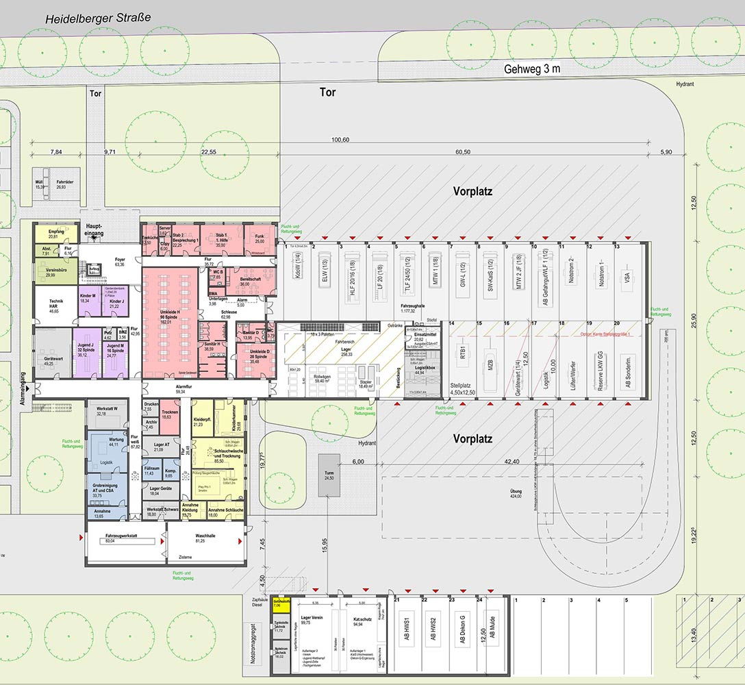- Feuerwache am Ortsrand für 12 Fahrzeuge, 7 Anhänger und 5 Abrollbehälter